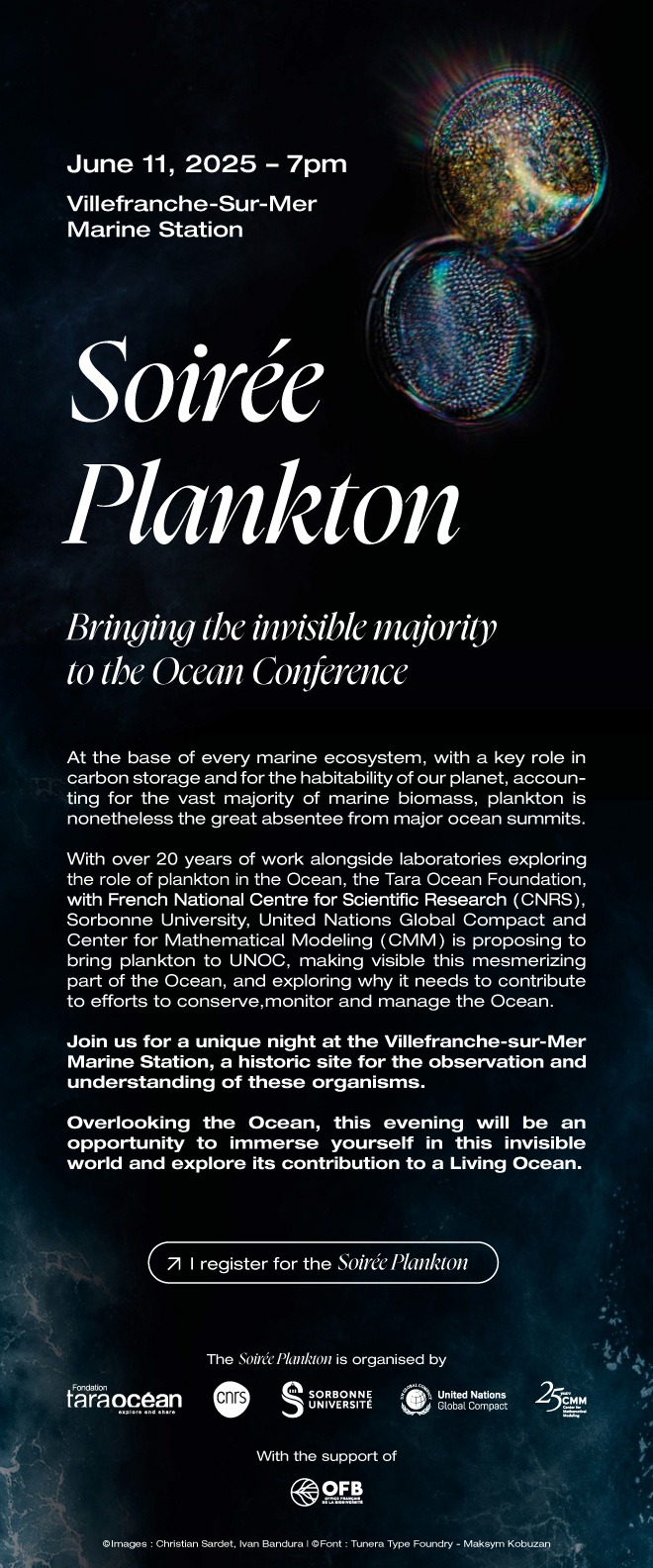 At the base of every marine ecosystem, with a key role in carbon storage and for the habitability of our planet, accounting for the vast majority of marine biomass, plankton is nonetheless the great absentee from major ocean summits. With over 20 years of work alongside laboratories exploring the role of plankton in the Ocean, the Tara Ocean Foundation, with French National Centre for Scientific Research (CNRS), Sorbonne University, United Nations Global Compact and Center for Mathematical Modeling (CMM), is proposing to bring plankton to UNOC, making visible this mesmerizing part of the Ocean, and exploring why it needs to contribute to efforts to conserve, monitor and manage the Ocean.