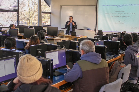 La primera sesión, realizada en la UdeC, comenzó con una presentación del investigador del CMM y académico de la Universidad del Bío-Bío (UBB) Ricardo Oyarzúa Vargas, quien enmarcó la actividad en el contexto del Proyecto Anillo DSALT“Parte importante de nuestro Proyecto es la vinculación con el medio, y con este evento inédito en Concepción –y probablemente en Chile–, buscamos acercar la matemática computacional a estudiantes de enseñanza media de la zona, para así dar cumplimiento con este importante componente del Proyecto Anillo”, explicó.