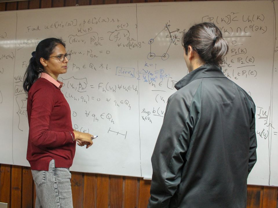 Por su parte, Eider Aldana explicó que “existen diversas EDPs que, aunque modelan fenómenos de gran relevancia científica y social, aún carecen de una demostración rigurosa sobre la existencia de soluciones” y agregó que esta área de estudio “posee una larga trayectoria de desarrollo y se ha consolidado como un campo amplio y en constante expansión, su aporte resulta fundamental frente a este tipo de problemas, ya que proporciona esquemas numéricos capaces de aproximar las soluciones con una velocidad de convergencia determinada”.