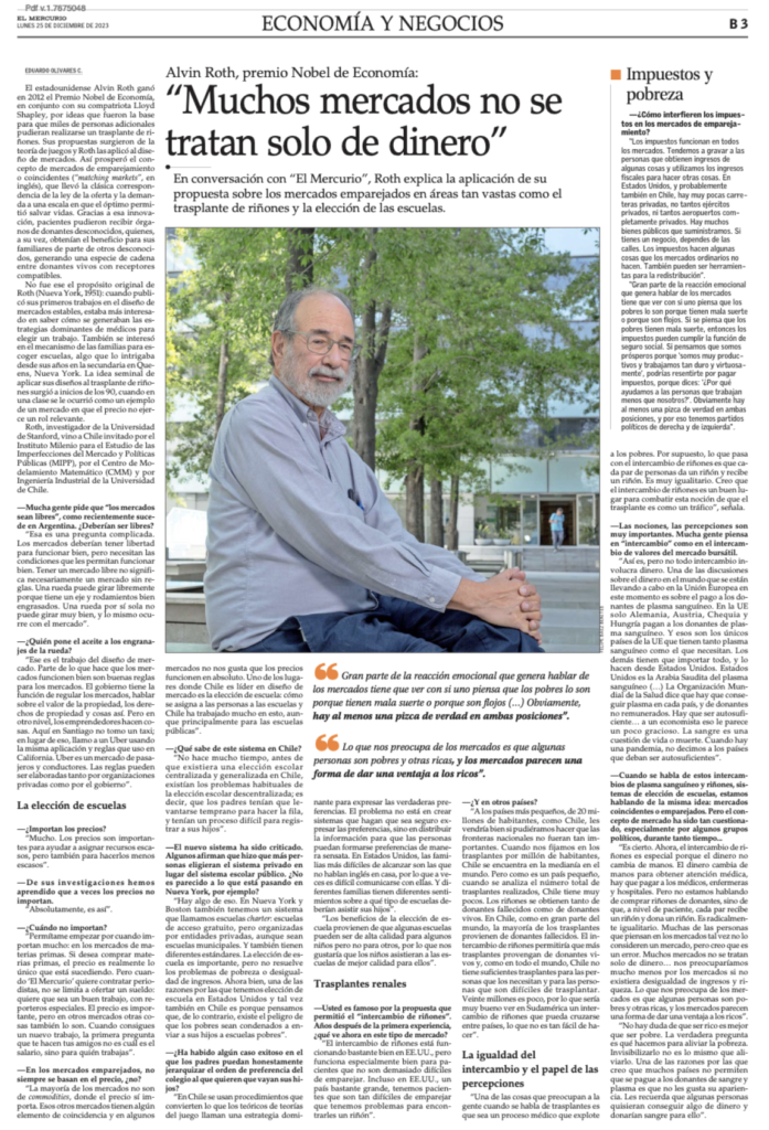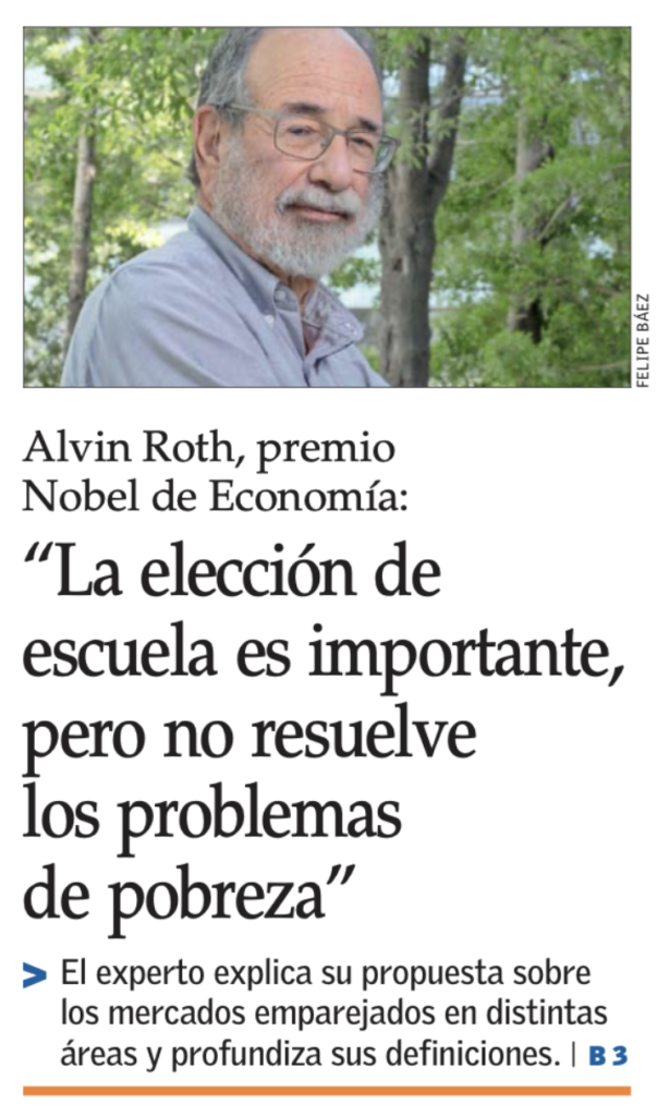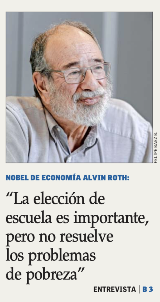 En conversación con “El Mercurio”, Roth explica la aplicación de su propuesta sobre los mercados emparejados en áreas tan vastas como el trasplante de riñones y la elección de las escuelas.