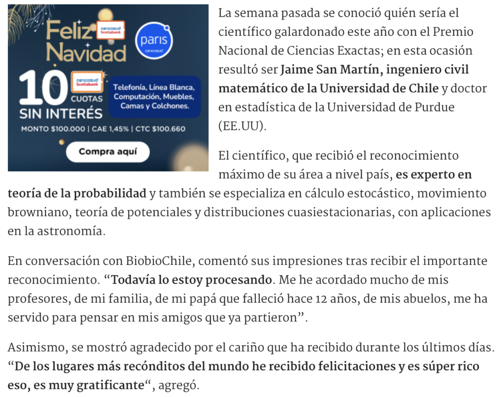 La semana pasada se conoció quién sería el científico galardonado este año con el Premio Nacional de Ciencias Exactas; en esta ocasión resultó ser Jaime San Martín, ingeniero civil matemático de la Universidad de Chile y doctor en estadística de la Universidad de Purdue (EE.UU).