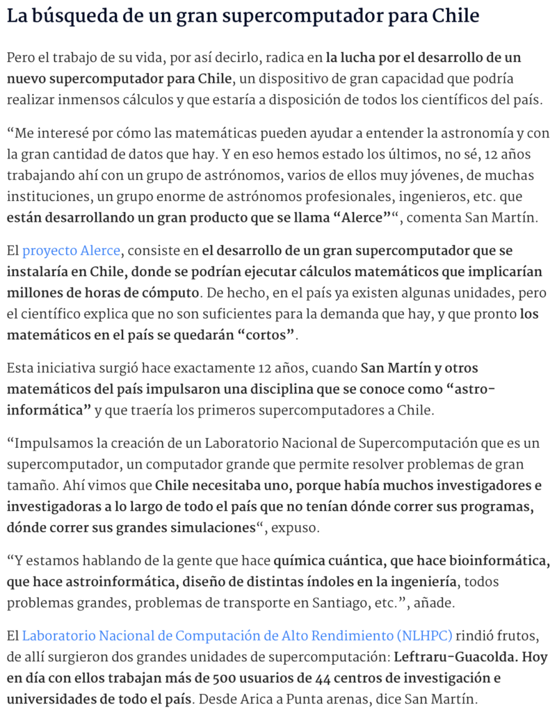 “Y estamos hablando de la gente que hace química cuántica, que hace bioinformática, que hace astroinformática, diseño de distintas índoles en la ingeniería, todos problemas grandes, problemas de transporte en Santiago, etc.”, añade.