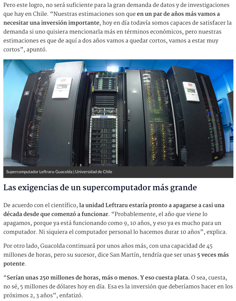 El Laboratorio Nacional de Computación de Alto Rendimiento (NLHPC) rindió frutos, de allí surgieron dos grandes unidades de supercomputación: Leftraru-Guacolda. Hoy en día con ellos trabajan más de 500 usuarios de 44 centros de investigación e universidades de todo el país. Desde Arica a Punta arenas, dice San Martín.