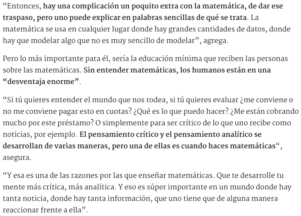 “Y esa es una de las razones por las que enseñar matemáticas. Que te desarrolle tu mente más crítica, más analítica. Y eso es súper importante en un mundo donde hay tanta noticia, donde hay tanta información, que uno tiene que de alguna manera reaccionar frente a ella”.