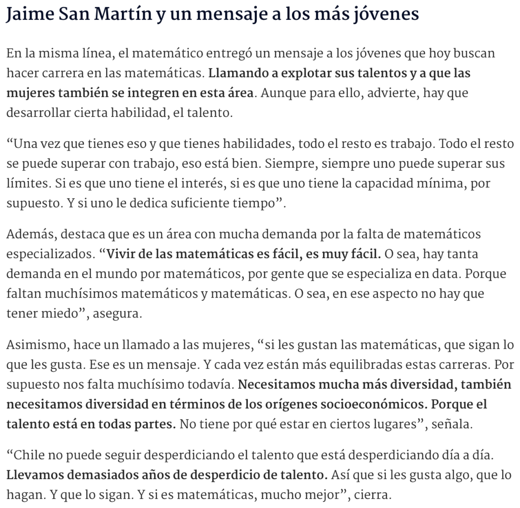 “Chile no puede seguir desperdiciando el talento que está desperdiciando día a día. Llevamos demasiados años de desperdicio de talento. Así que si les gusta algo, que lo hagan. Y que lo sigan. Y si es matemáticas, mucho mejor”, cierra.