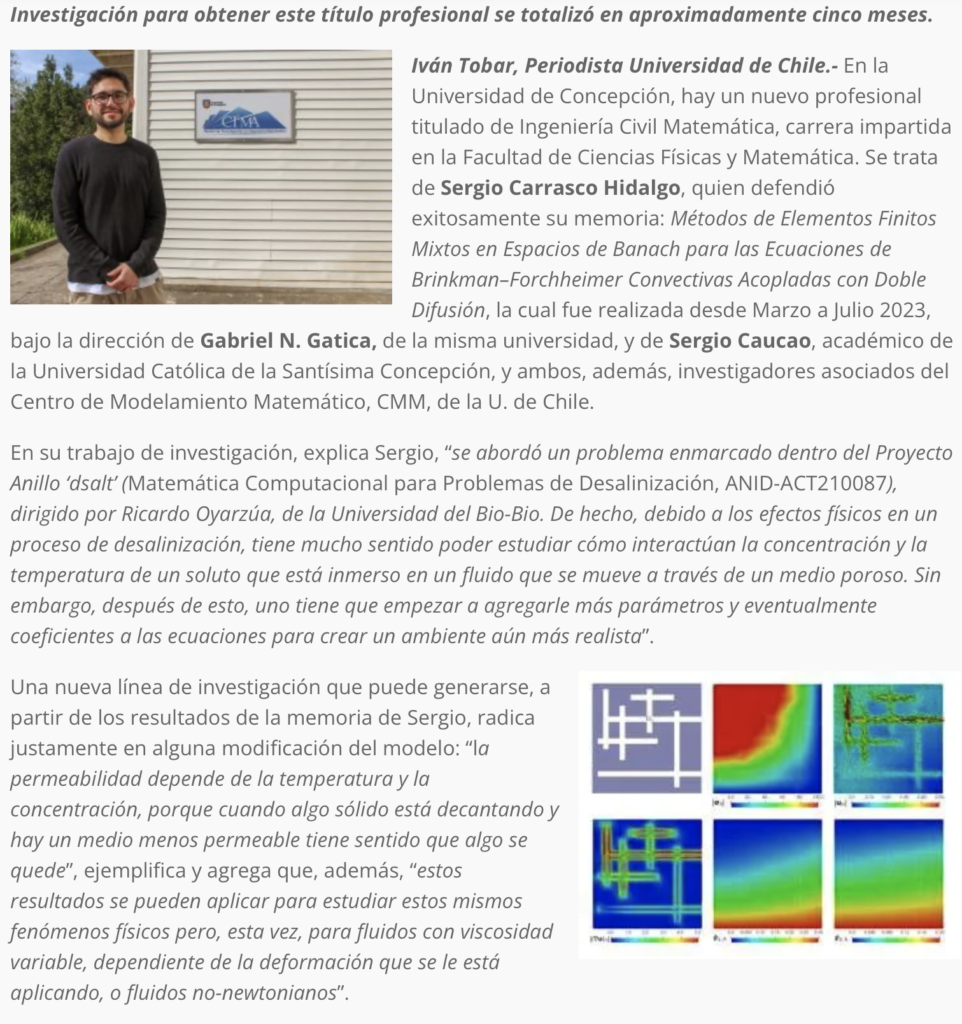 En la Universidad de Concepción, hay un nuevo profesional titulado de Ingeniería Civil Matemática, carrera impartida en la Facultad de Ciencias Físicas y Matemática. Se trata de Sergio Carrasco Hidalgo, quien defendió exitosamente su memoria: Métodos de Elementos Finitos Mixtos en Espacios de Banach para las Ecuaciones de Brinkman–Forchheimer Convectivas Acopladas con Doble Difusión, la cual fue realizada desde Marzo a Julio 2023, bajo la dirección de Gabriel N. Gatica, de la misma universidad, y de Sergio Caucao, académico de la Universidad Católica de la Santísima Concepción, y ambos, además, investigadores asociados del Centro de Modelamiento Matemático, CMM, de la U. de Chile.