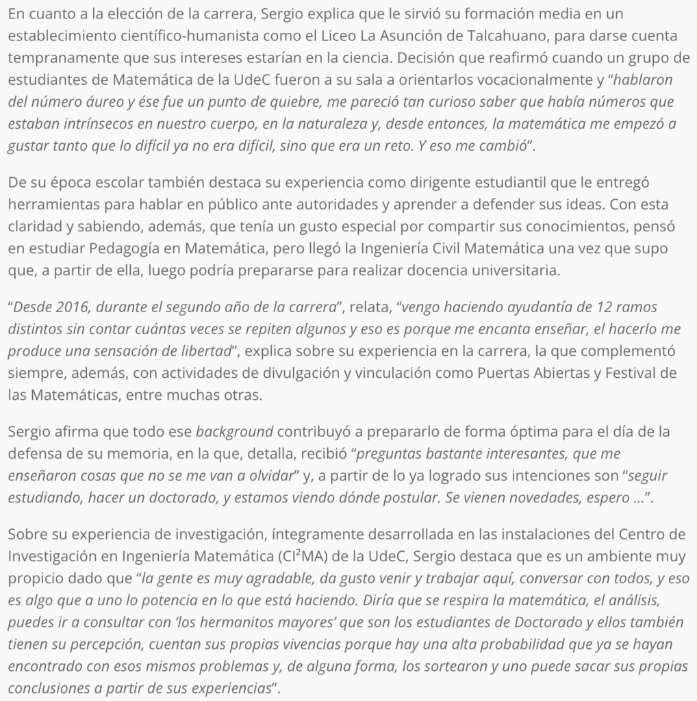 En cuanto a la elección de la carrera, Sergio explica que le sirvió su formación media en un establecimiento científico-humanista como el Liceo La Asunción de Talcahuano, para darse cuenta tempranamente que sus intereses estarían en la ciencia. Decisión que reafirmó cuando un grupo de estudiantes de Matemática de la UdeC fueron a su sala a orientarlos vocacionalmente y “hablaron del número áureo y ése fue un punto de quiebre, me pareció tan curioso saber que había números que estaban intrínsecos en nuestro cuerpo, en la naturaleza y, desde entonces, la matemática me empezó a gustar tanto que lo difícil ya no era difícil, sino que era un reto. Y eso me cambió”.
