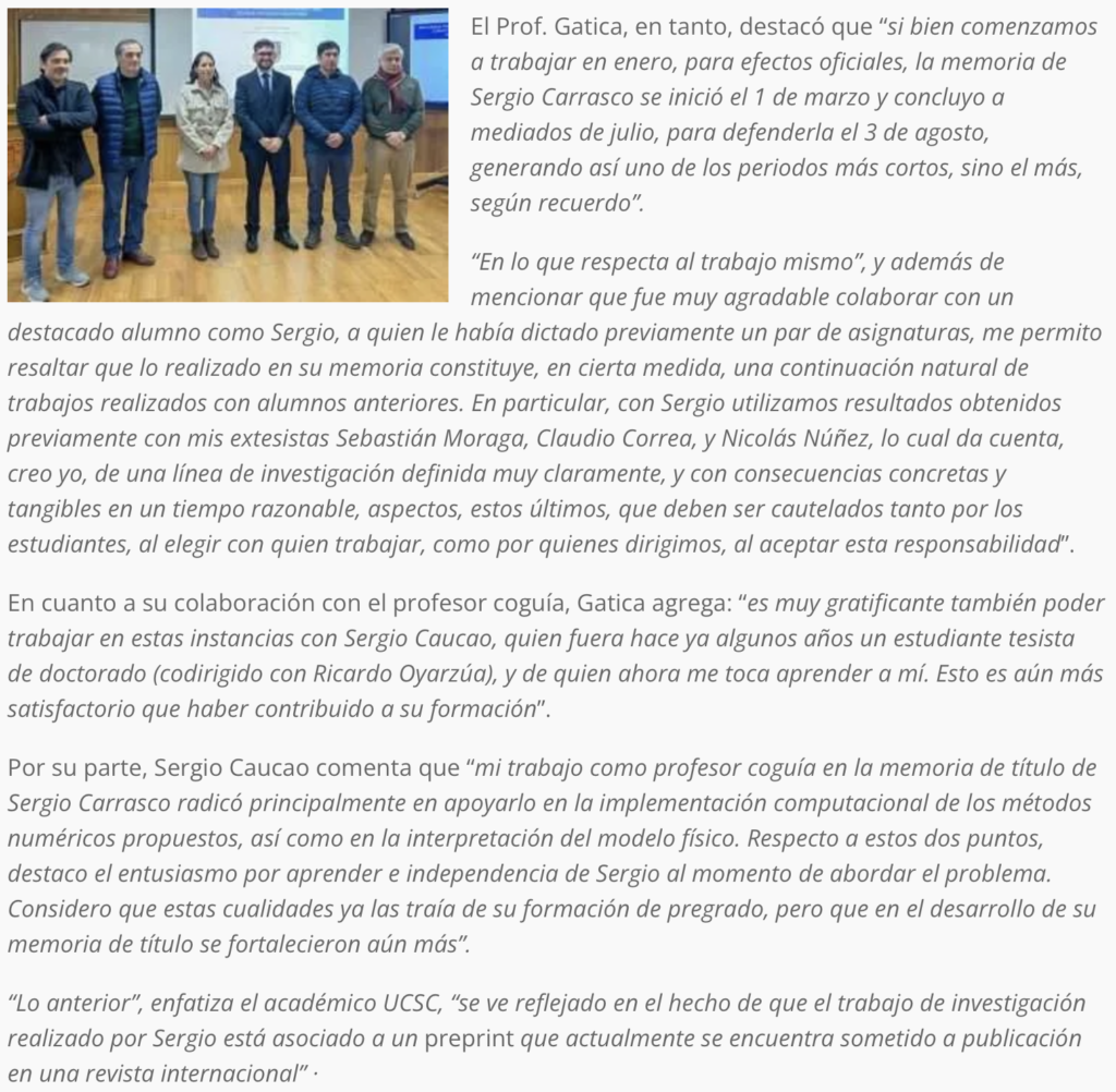 Por su parte, Sergio Caucao comenta que “mi trabajo como profesor coguía en la memoria de título de Sergio Carrasco radicó principalmente en apoyarlo en la implementación computacional de los métodos numéricos propuestos, así como en la interpretación del modelo físico. Respecto a estos dos puntos, destaco el entusiasmo por aprender e independencia de Sergio al momento de abordar el problema. Considero que estas cualidades ya las traía de su formación de pregrado, pero que en el desarrollo de su memoria de título se fortalecieron aún más”.