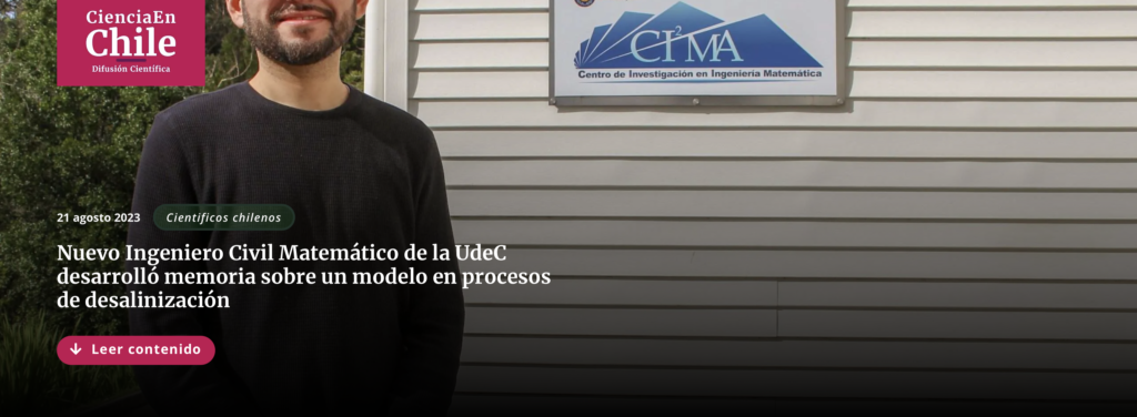 En su trabajo de investigación, explica Sergio, “se abordó un problema enmarcado dentro del Proyecto Anillo ‘dsalt’ (Matemática Computacional para Problemas de Desalinización, ANID-ACT210087), dirigido por Ricardo Oyarzúa, de la Universidad del Bio-Bio. De hecho, debido a los efectos físicos en un proceso de desalinización, tiene mucho sentido poder estudiar cómo interactúan la concentración y la temperatura de un soluto que está inmerso en un fluido que se mueve a través de un medio poroso. Sin embargo, después de esto, uno tiene que empezar a agregarle más parámetros y eventualmente coeficientes a las ecuaciones para crear un ambiente aún más realista”.