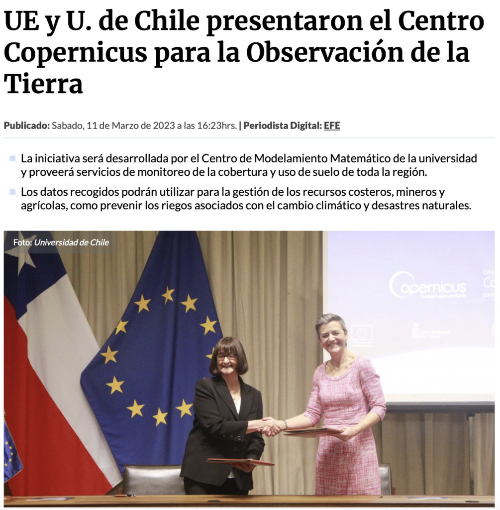 Al respecto, la vicepresidenta ejecutiva de la Comisión Europea, Margrethe Vestager, señaló que “el fortalecimiento del centro tendrá un impacto muy relevante en Chile y la región. Los datos proporcionados por Copernicus, el programa de observación de la Tierra más grande del mundo, se pueden utilizar para aplicaciones concretas que pueden tener un gran valor comercial y social”.