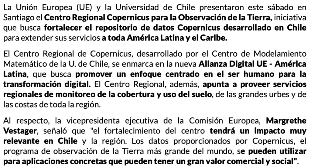 El Centro Regional de Copernicus, desarrollado por el Centro de Modelamiento Matemático de la U. de Chile, se enmarca en la nueva Alianza Digital UE – América Latina, que busca promover un enfoque centrado en el ser humano para la transformación digital. El Centro Regional, además, apunta a proveer servicios regionales de monitoreo de la cobertura y uso del suelo, de las grandes urbes y de las costas de toda la región.