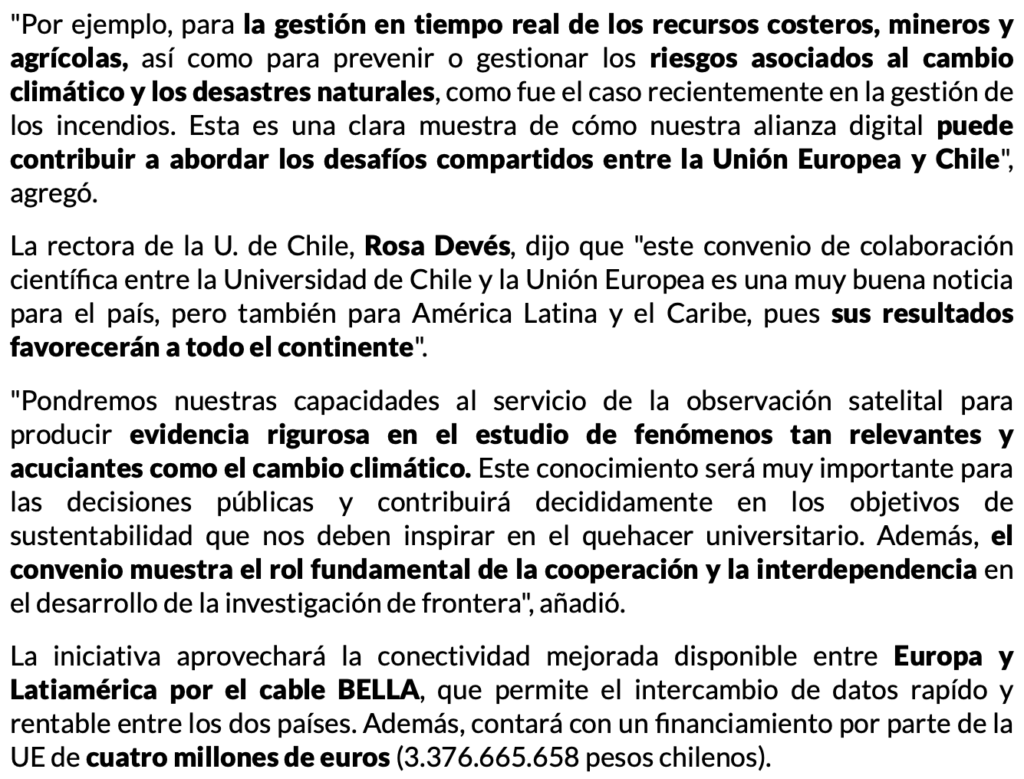 “Por ejemplo, para la gestión en tiempo real de los recursos costeros, mineros y agrícolas, así como para prevenir o gestionar los riesgos asociados al cambio climático y los desastres naturales, como fue el caso recientemente en la gestión de los incendios. Esta es una clara muestra de cómo nuestra alianza digital puede contribuir a abordar los desafíos compartidos entre la Unión Europea y Chile“, agregó.