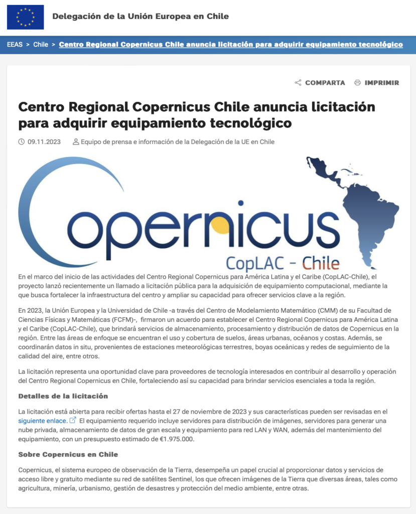 “En el marco del inicio de las actividades del Centro Regional Copernicus para América Latina y el Caribe (CopLAC-Chile), el proyecto lanzó recientemente un llamado a licitación pública para la adquisición de equipamiento computacional, mediante la que busca fortalecer la infraestructura del centro y ampliar su capacidad para ofrecer servicios clave a la región”, destaca la sala de redacción de la Delegación de la Unión Europea en Chile. “En 2023, la Unión Europea y la Universidad de Chile –a través del Centro de Modelamiento Matemático (CMM) de su Facultad de Ciencias Físicas y Matemáticas (FCFM)–, firmaron un acuerdo para establecer el Centro Regional Copernicus para América Latina y el Caribe (CopLAC-Chile), que brindará servicios de almacenamiento, procesamiento y distribución de datos de Copernicus en la región. Entre las áreas de enfoque se encuentran el uso y cobertura de suelos, áreas urbanas, océanos y costas. Además, se coordinarán datos in situ, provenientes de estaciones meteorológicas terrestres, boyas oceánicas y redes de seguimiento de la calidad del aire, entre otros”, señala la publicación.