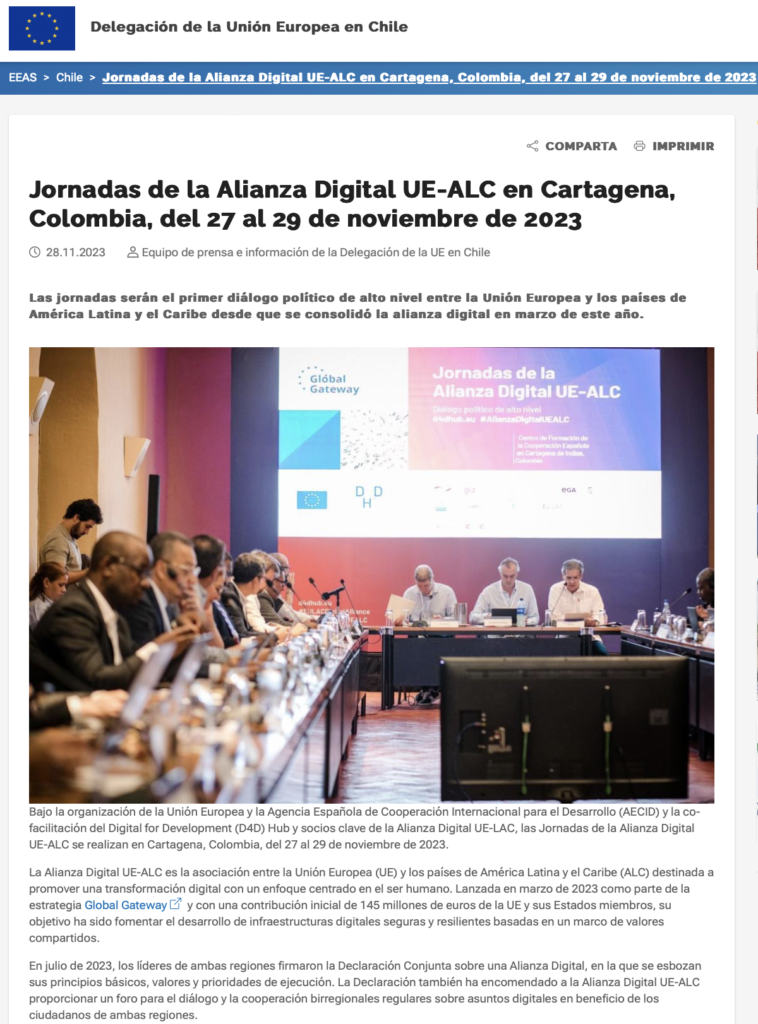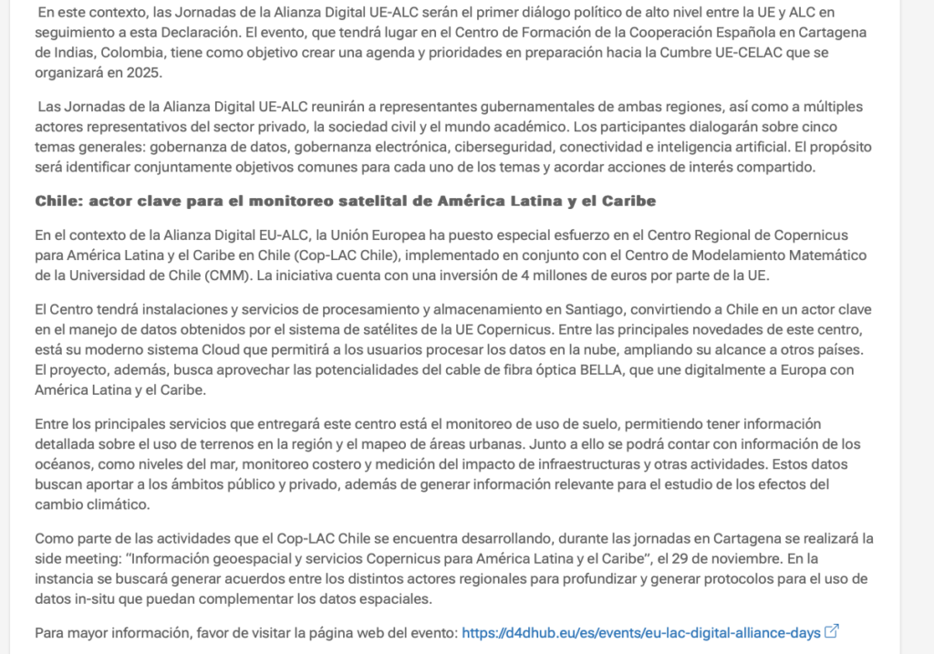 “Las jornadas serán el primer diálogo político de alto nivel entre la Unión Europea y los países de América Latina y el Caribe desde que se consolidó la alianza digital en marzo de este año”, destaca la sala de redacción de la Delegación de la Unión Europea en Chile. “En el contexto de la Alianza Digital EU-ALC, la Unión Europea ha puesto especial esfuerzo en el Centro Regional de Copernicus para América Latina y el Caribe en Chile (Cop-LAC Chile), implementado en conjunto con el Centro de Modelamiento Matemático de la Universidad de Chile (CMM). La iniciativa cuenta con una inversión de 4 millones de euros por parte de la UE”, señala la publicación.