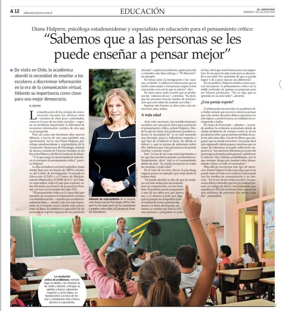 Diane Halpern en El Mercurio: “Sabemos que a las personas se les puede enseñar a pensar mejor”