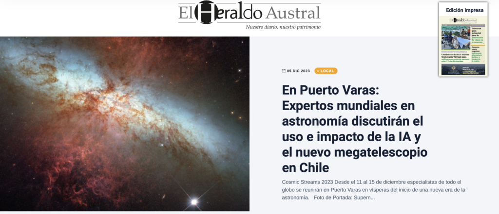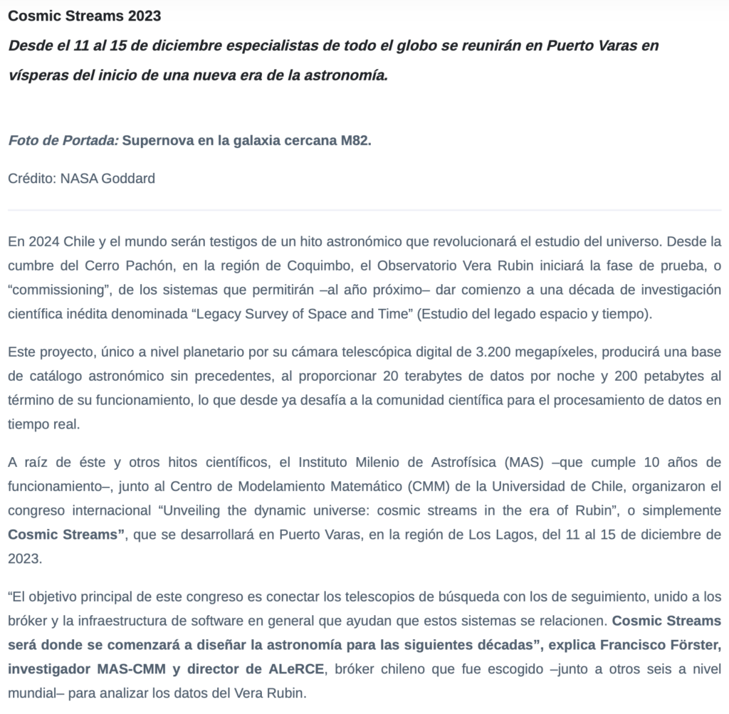 A raíz de éste y otros hitos científicos, el Instituto Milenio de Astrofísica (MAS) –que cumple 10 años de funcionamiento–, junto al Centro de Modelamiento Matemático (CMM) de la Universidad de Chile, organizaron el congreso internacional “Unveiling the dynamic universe: cosmic streams in the era of Rubin”, o simplemente Cosmic Streams”, que se desarrollará en Puerto Varas, en la región de Los Lagos, del 11 al 15 de diciembre de 2023.