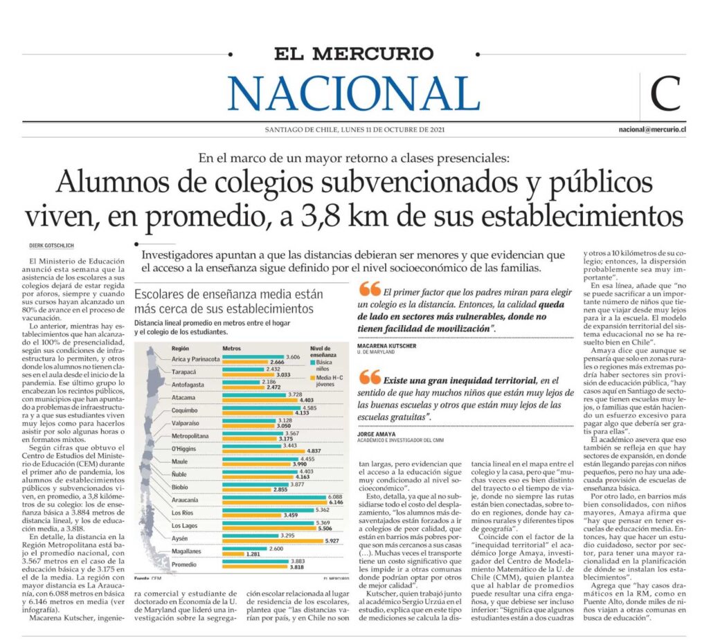 “Investigadores apuntan a que las distancias debieran ser menores y que evidencian que el acceso a la enseñanza sigue definido por el nivel socioeconómico de las familias”, señala el medio nacional. “Existe una gran inequidad territorial, en el sentido de que hay muchos niños que están muy lejos de las buenas escuelas y otros que están muy lejos de las escuelas gratuitas”, apunta Jorge Amaya, investigador  del Centro de Modelamiento Matemático (CMM) de la U. de Chile.