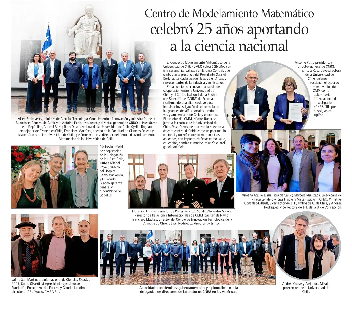“El Centro de Modelamiento Matemático de la Universidad de Chile celebró 25 años con una ceremonia realizada en la Casa Central, que contó con la presencia del Presidente Gabriel Boric, autoridades académicas y científicas, y representantes de la industria y ministerios”, destaca el medio nacional. “En la ocasión se renovó el acuerdo de cooperación entre la Universidad de Chile y el Centre National de la Recherche Scientifique (CNRS) de Francia, reafirmando una alianza clave para impulsar investigación de excelencia en los grandes desafíos sociales, productivos y ambientales de Chile y el mundo. El director del CMM, Héctor Ramírez, junto a la Rectora Rosa Devés, destacaron la relevancia de este centro, definido como un patrimonio nacional y un referente en matemáticas aplicadas, con impacto en áreas como salud, educación, cambio climático, minería e inteligencia artificial”, publica El Mercurio en la sección Vida Social.