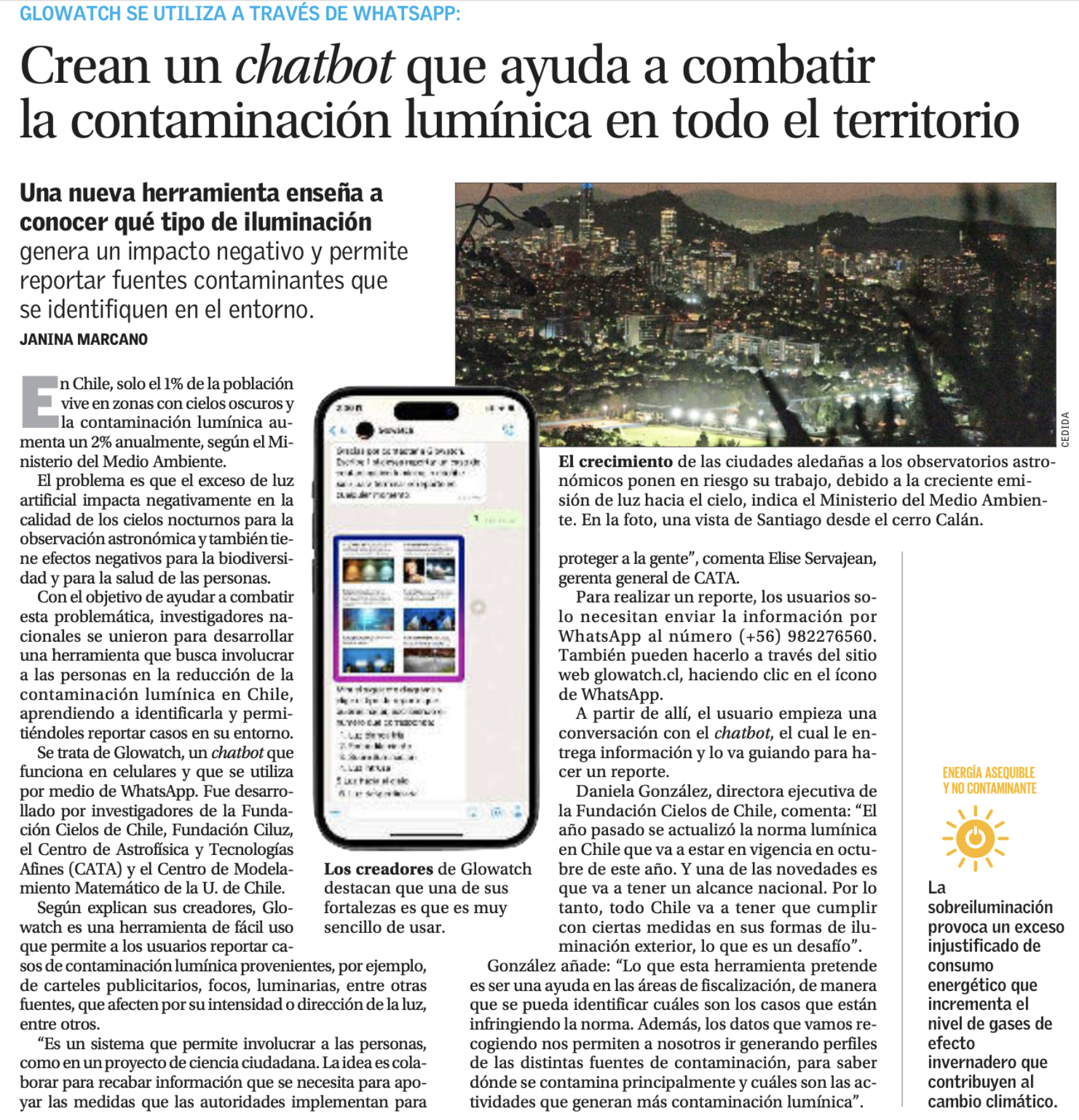 Se trata de Glowatch, un chatbot que funciona en celulares y que se utiliza por medio de WhatsApp. Fue desarrollado por investigadores de la Fundación Cielos de Chile, Fundación Ciluz, el Centro de Astrofísica y Tecnologías Afines (CATA) y el Centro de Modelamiento Matemático de la U. de Chile.