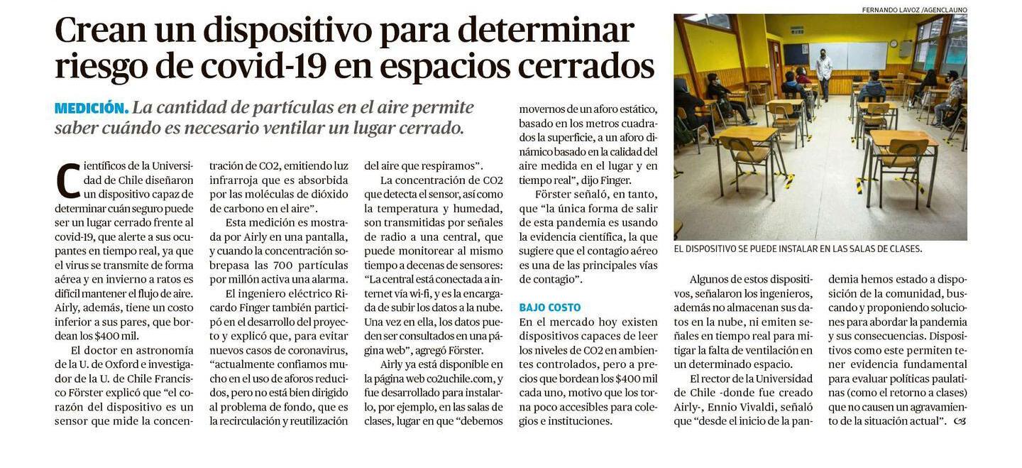 Nota sobre el proyecto Airly desarrollado por un equipo liderado por Francisco Förster, doctor en Astronomía e investigador del Centro de Modelamiento Matemático (CMM), Ricardo Finger, doctor en Ingeniería Eléctrica e investigador del Centro de Astrofísica y Tecnologías Afines (CATA) –ambos centros de excelencia de la Universidad de Chile–, y Pablo Farah.