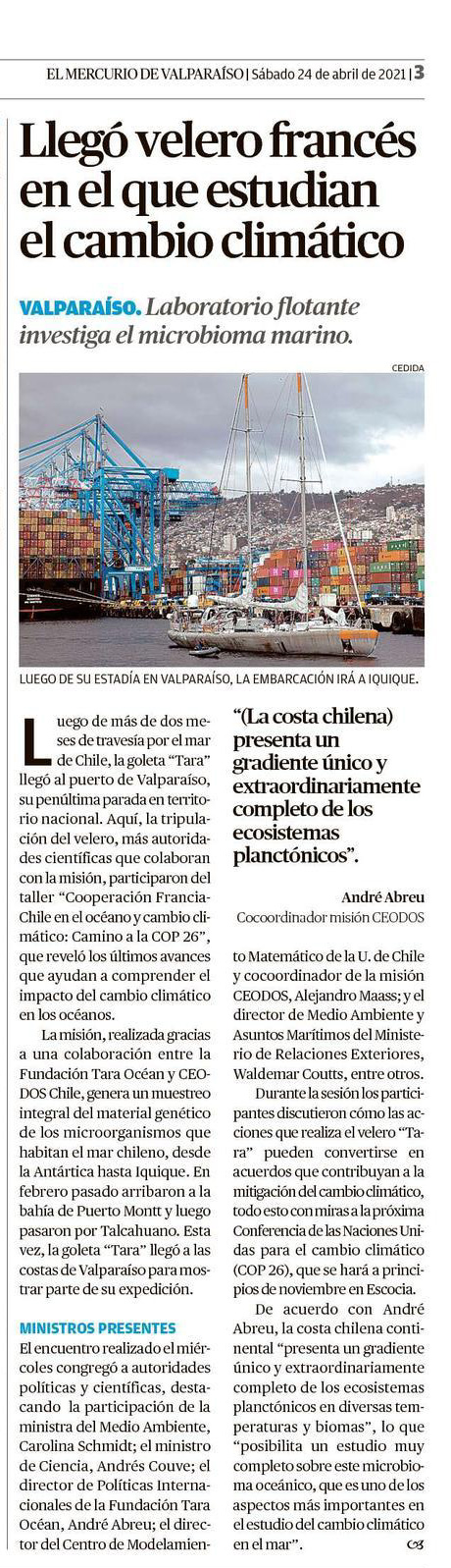 Nota en el medio regional sobre la misión desarrollada por la Fundación Tara Océan en colaboración con el programa Ceodos en que participa el Centro de Modelamiento Matemático de la Universidad de Chile, y el evento Cooperación Francia-Chile en Océanos y cambio climático: Camino a la COP26. Taller de alto nivel 1: de la ciencia a la política.