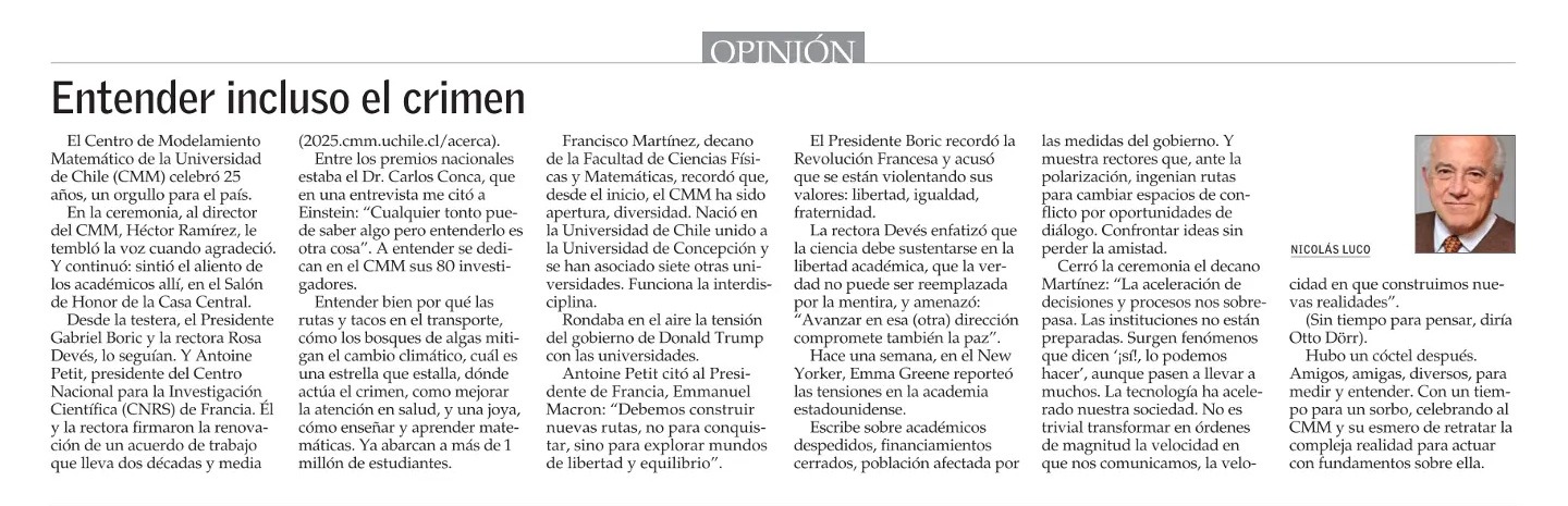 “El Centro de Modelamiento Matemático de la Universidad de Chile (CMM) celebró 25 años, un orgullo para el país”, destaca el columnista Nicolás Luco en el medio nacional. “Entre los premios nacionales estaba el Dr. Carlos Conca, que en una entrevista me citó a Einstein: «Cualquier tonto puede saber algo pero entenderlo es otra cosa». A entender se dedican en el CMM sus 80 investigadores. Entender bien por qué las rutas y tacos en el transporte, cómo los bosques de algas mitigan el cambio climático, cuál es una estrella que estalla, dónde actúa el crimen, como mejorar la atención en salud, y una joya, cómo enseñar y aprender matemáticas. Ya abarcan a más de 1 millón de estudiantes”, rescata en su columna de El Mercurio.