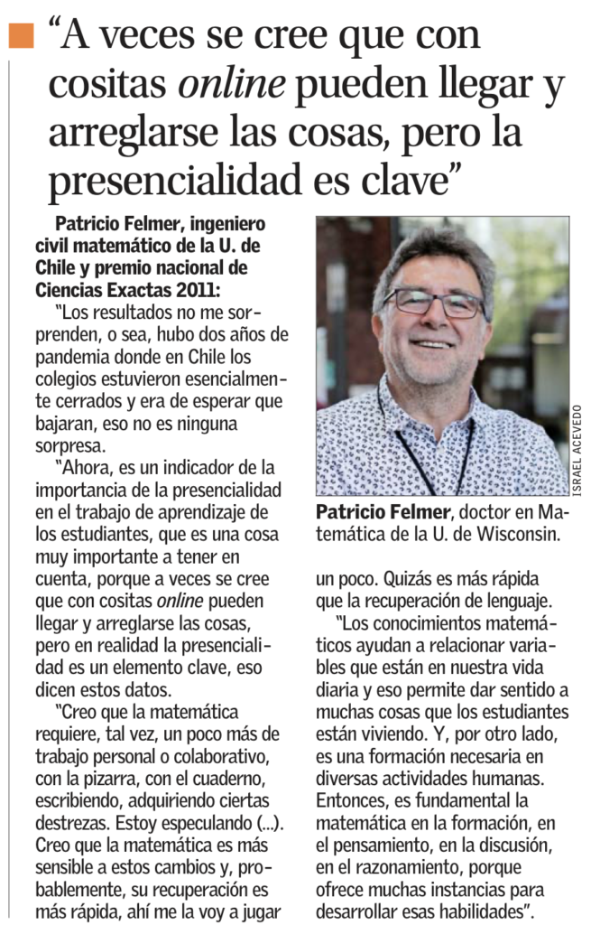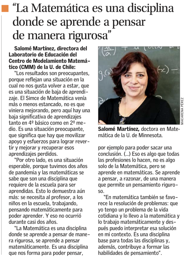 El artículo se refiere a los resultados de la prueba Simce de este año. “En Matemática es donde se nota la importancia de la presencialidad”, destaca el medio nacional. Patricio Felmer, investigador del Centro de Modelamiento Matemático (CMM) y director de la iniciativa ARPA, aparece señalando «A veces se cree que con cositas online pueden llegar y arreglarse las cosas, pero la presencialidad es clave». Por su parte, Salomé Martínez, investigadora principal del CMM y directora del Laboratorio de Educación CMM-Edu, interviene bajo la frase «La Matemática es una disciplina donde se aprende a pensar de manera rigurosa».