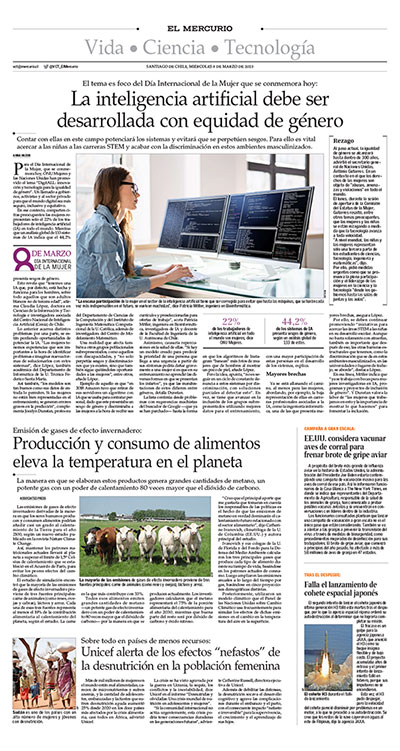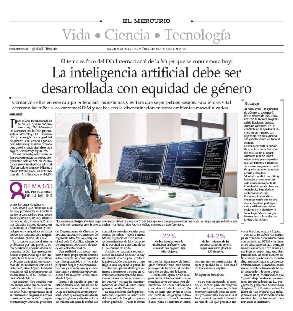 “Las mujeres representan solo el 22% de los trabajadores de inteligencia artificial (IA) en todo el mundo […] «Los modelos son tan buenos como sus datos de entrada lo permiten. Si las mujeres no están bien representadas en el entrenamiento, se generan errores graves en la predicción», complementa Jocelyn Dunstan, profesora del Departamento de Ciencias de la Computación y del Instituto de Ingeniería Matemática Computacional de la U. Católica, además de investigadora del Centro de Modelamiento Matemático”, destaca el medio nacional.
