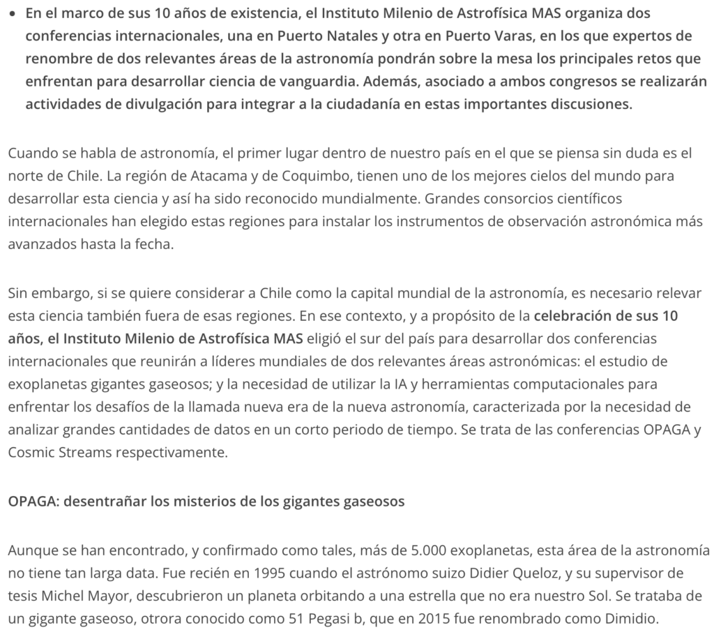 Sin embargo, si se quiere considerar a Chile como la capital mundial de la astronomía, es necesario relevar esta ciencia también fuera de esas regiones. En ese contexto, y a propósito de la celebración de sus 10 años, el Instituto Milenio de Astrofísica MAS eligió el sur del país para desarrollar dos conferencias internacionales que reunirán a líderes mundiales de dos relevantes áreas astronómicas: el estudio de exoplanetas gigantes gaseosos; y la necesidad de utilizar la IA y herramientas computacionales para enfrentar los desafíos de la llamada nueva era de la nueva astronomía, caracterizada por la necesidad de analizar grandes cantidades de datos en un corto periodo de tiempo. Se trata de las conferencias OPAGA y Cosmic Streams respectivamente.