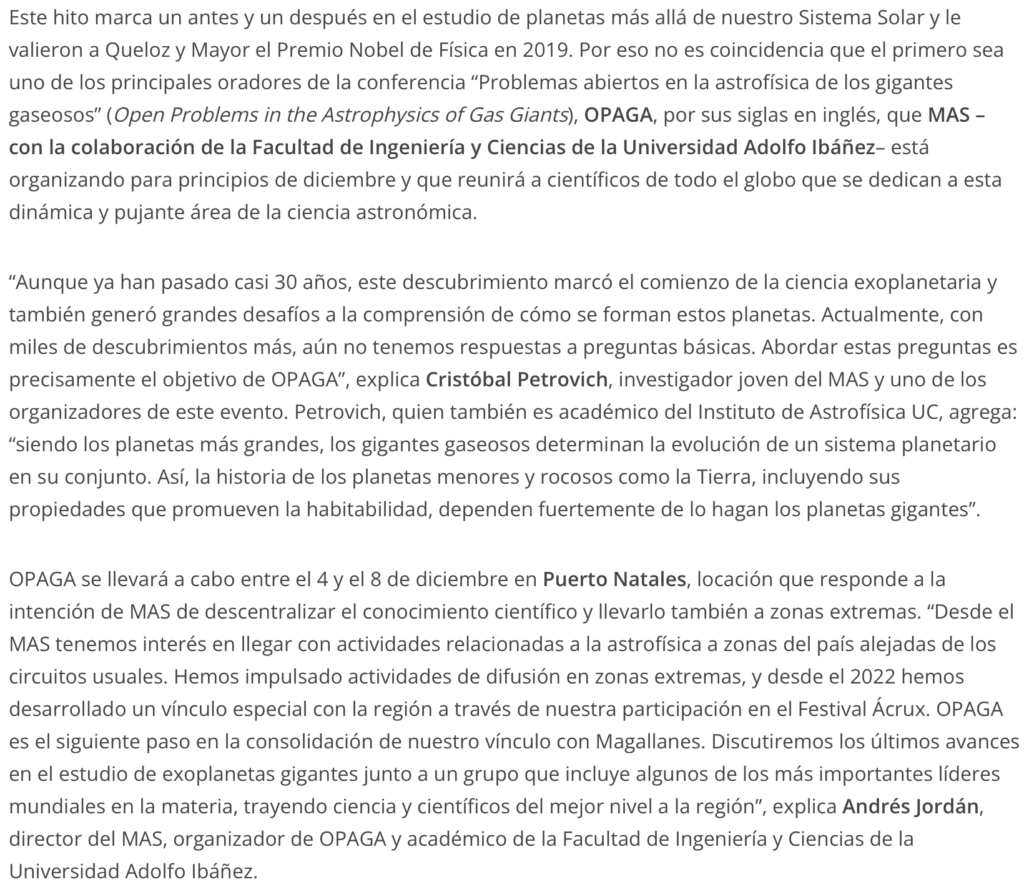 Desde el MAS tenemos interés en llegar con actividades relacionadas a la astrofísica a zonas del país alejadas de los circuitos usuales. Hemos impulsado actividades de difusión en zonas extremas, y desde el 2022 hemos desarrollado un vínculo especial con la región a través de nuestra participación en el Festival Ácrux. OPAGA es el siguiente paso en la consolidación de nuestro vínculo con Magallanes. Discutiremos los últimos avances en el estudio de exoplanetas gigantes junto a un grupo que incluye algunos de los más importantes líderes mundiales en la materia, trayendo ciencia y científicos del mejor nivel a la región.