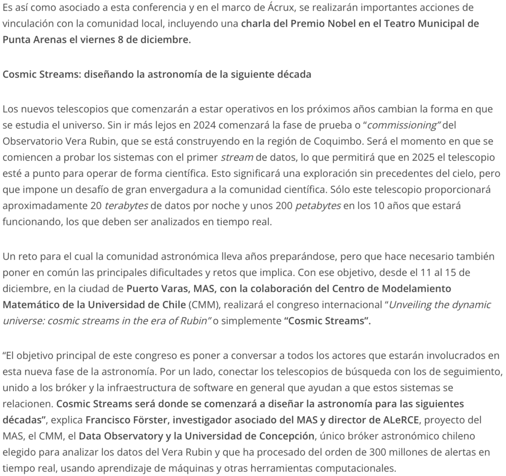 Es así como asociado a esta conferencia y en el marco de Ácrux, se realizarán importantes acciones de vinculación con la comunidad local, incluyendo una charla del Premio Nobel en el Teatro Municipal de Punta Arenas el viernes 8 de diciembre.