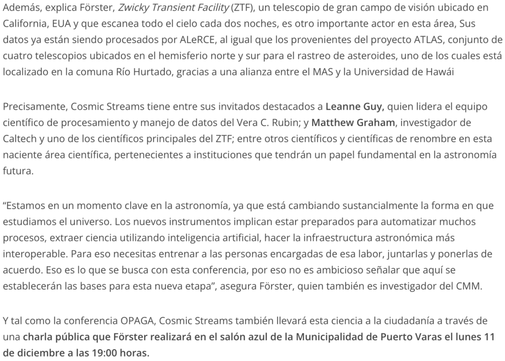 Y tal como la conferencia OPAGA, Cosmic Streams también llevará esta ciencia a la ciudadanía a través de una charla pública que Förster realizará en el salón azul de la Municipalidad de Puerto Varas el lunes 11 de diciembre a las 19:00 horas.