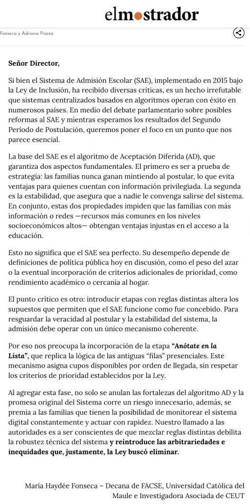 En una carta al director publicada por El Mostrador el pasado 12 de diciembre, la investigadora asociada del Centro de Modelamiento Matemático (CMM) y académica de la Facultad de Economía y Negocios de la Universidad de Chile, Adriana Piazza, junto a María Haydée Fonseca, decana de la Facultad de Ciencias de la Educación de la Universidad Católica del Maule, abordaron los desafíos y riesgos asociados a eventuales modificaciones al Sistema de Admisión Escolar (SAE).