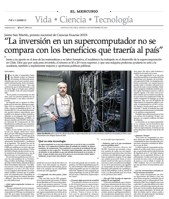 Junto a su aporte en el área de las matemáticas y su labor formativa, el académico ha trabajado en el desarrollo de la supercomputación en Chile. Dice que por cada peso invertido, el retorno es 10 a 20 veces superior, y que una máquina poderosa ayudaría no solo a la academia, también a implementar mejores y oportunas políticas públicas.