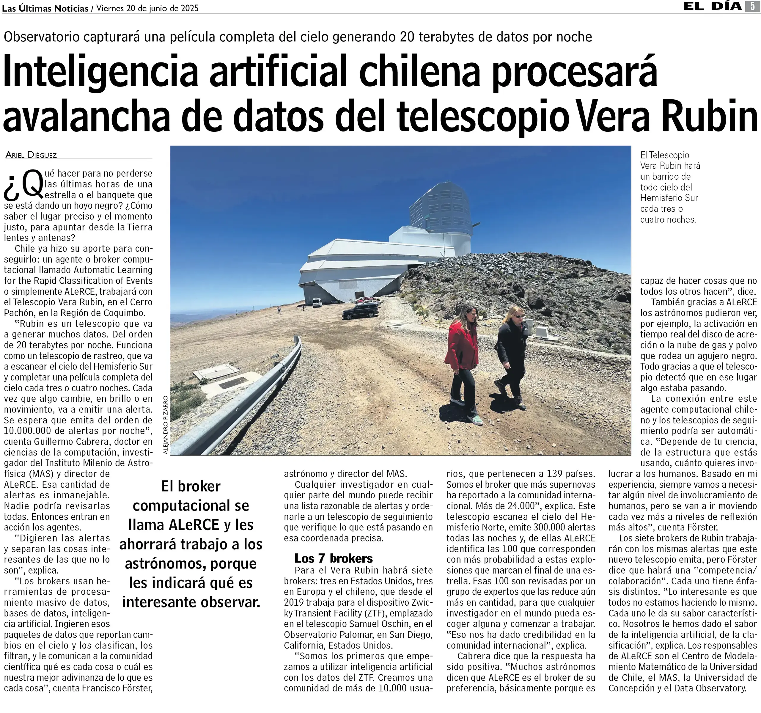 «¿Qué hacer para no perderse las últimas horas de una estrella o el banquete que se está dando un hoyo negro? ¿Cómo saber el lugar preciso y el momento justo, para apuntar desde la Tierra lentes y antenas? Chile ya hizo su aporte para conseguirlo: un agente o broker computacional llamado Automatic Learning for the Rapid Classification of Events o simplemente ALeRCE, trabajará con el Telescopio Vera Rubin, en el Cerro Pachón, en la Región de Coquimbo. “Rubin es un telescopio que va a generar muchos datos. Del orden de 20 terabytes por noche. Funciona como un telescopio de rastreo, que va a escanear el cielo del Hemisferio Sur y completar una película completa del cielo cada tres o cuatro noches. Cada vez que algo cambie, en brillo o en movimiento, va a emitir una alerta. Se espera que emita del orden de 10.000.000 de alertas por noche” cuenta Guillermo Cabrera, doctor en ciencias de la computación, investigador del Instituto Milenio de Astrofísica (MAS) y director de ALeRCE. Esa cantidad de alertas es inmanejable. Nadie podría revisarlas todas. Entonces entran en acción los agentes. “Digieren las alertas y separan las cosas interesantes de las que no lo son”, explica», releva el tradicional diario. “Los responsables de ALeRCE son el Centro de Modelamiento Matemático (CMM) de la Universidad de Chile, el MAS, la Universidad de Concepción y el Data Observatory”, cierra la nota.