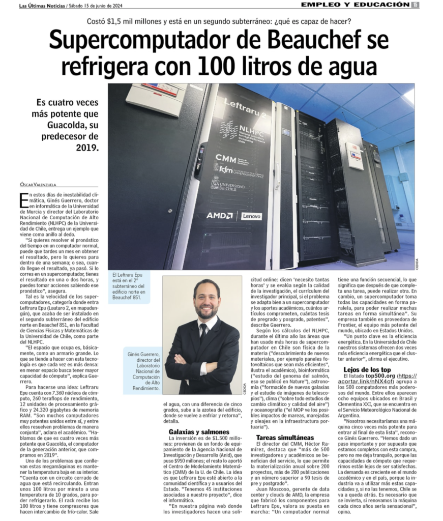 Tal es la velocidad de los supercomputadores, categoría donde entra Leftraru Epu (Lautaro 2, en mapudungún), que acaba de ser instalado en el segundo subterráneo del edificio norte en Beauchef 851, en la Facultad de Ciencias Físicas y Matemáticas de la Universidad de Chile, como parte del NLHPC.