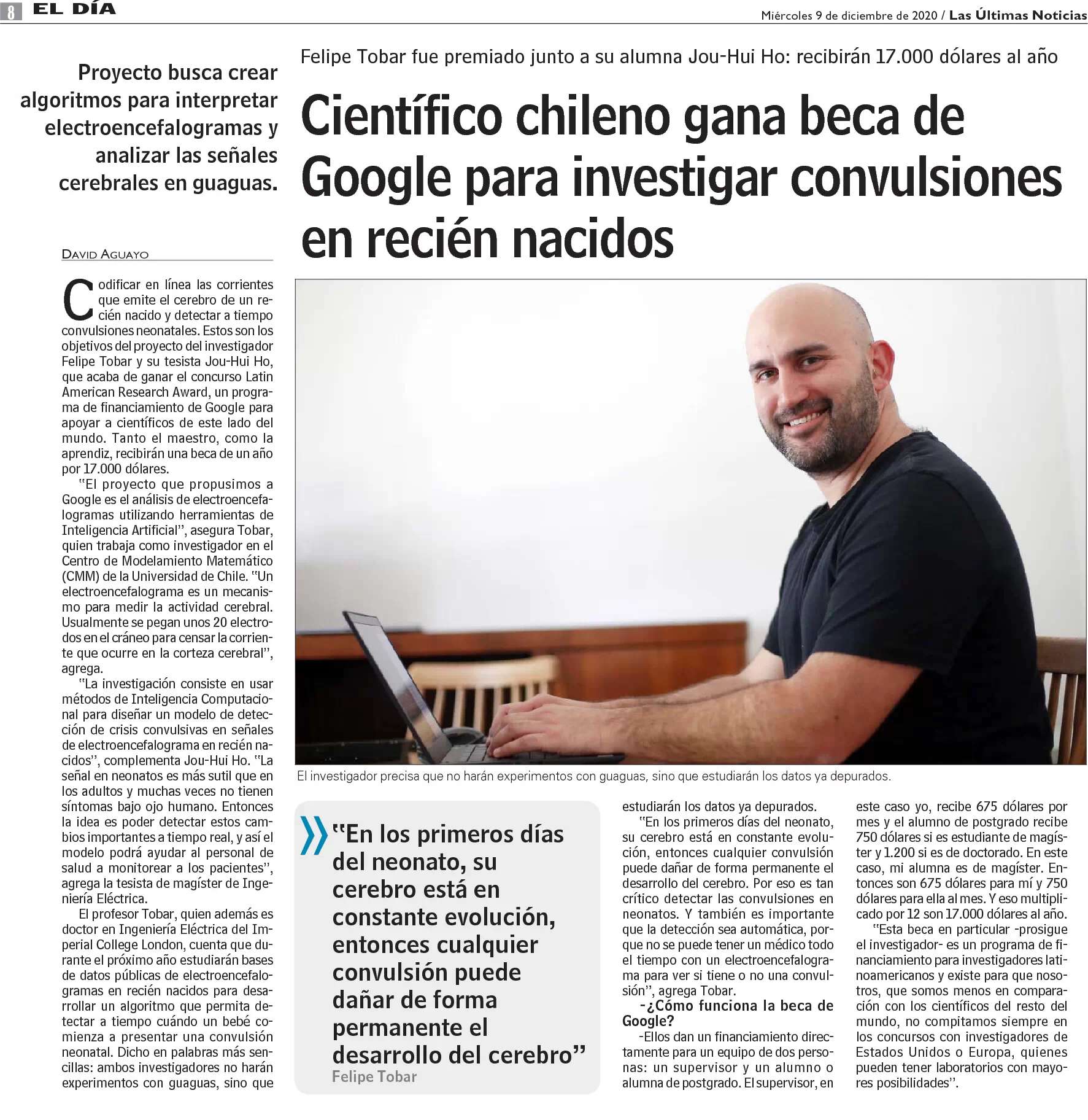 Felipe Tobar, investigador del Centro de Modelamiento Matemático (CMM) de la Universidad de Chile, fue premiado junto a su alumna Jou-Hui Ho: recibirán 17.000 dólares al año, señala la noticia publicada en Las Últimas Noticias. “Proyecto buscar crear algoritmos para interpretar electroencefalogramas y analizar las señales cerebrales en guaguas”, destaca el medio nacional.