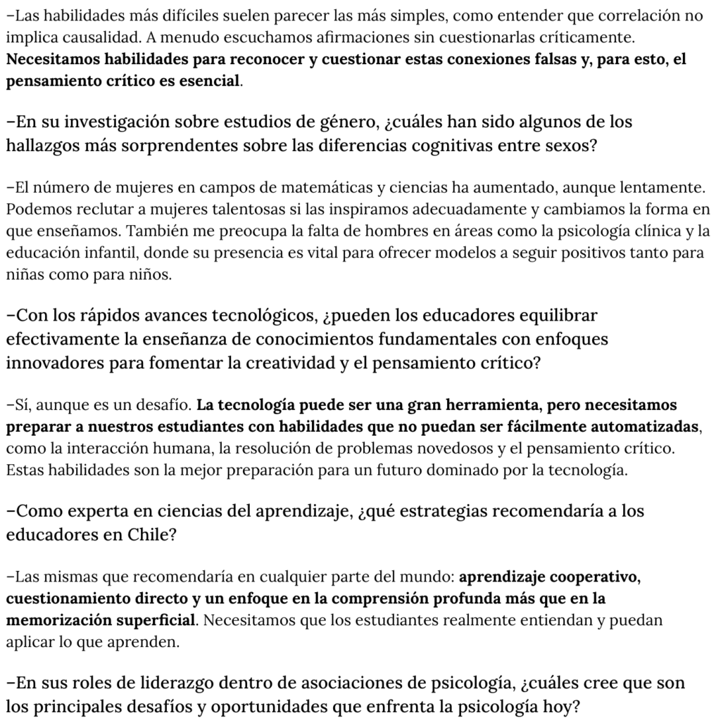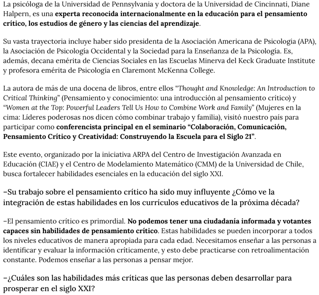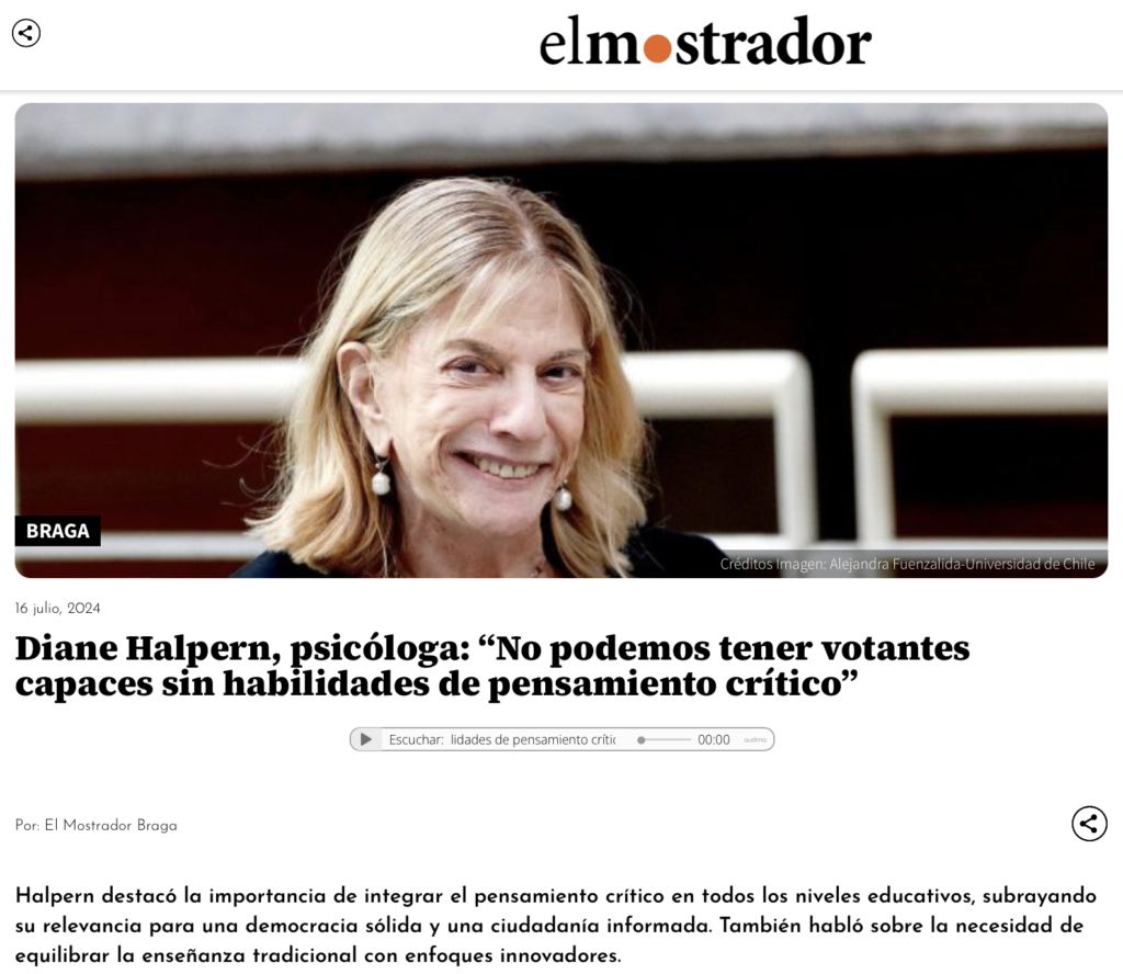 Psicóloga Diane Halpern en El Mostrador: “No podemos tener votantes capaces sin habilidades de pensamiento crítico”