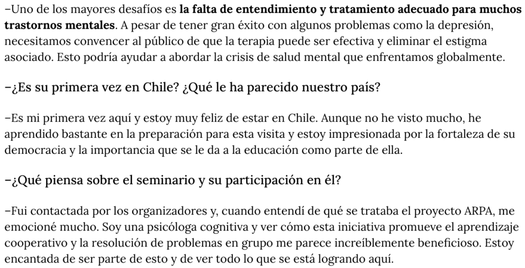 –Fui contactada por los organizadores y, cuando entendí de qué se trataba el proyecto ARPA, me emocioné mucho. Soy una psicóloga cognitiva y ver cómo esta iniciativa promueve el aprendizaje cooperativo y la resolución de problemas en grupo me parece increíblemente beneficioso. Estoy encantada de ser parte de esto y de ver todo lo que se está logrando aquí.