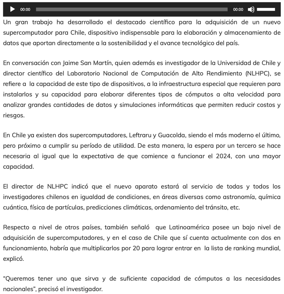 En Chile ya existen dos supercomputadores, Leftraru y Guacolda, siendo el más moderno el último, pero próximo a cumplir su período de utilidad. De esta manera, la espera por un tercero se hace necesaria al igual que la expectativa de que comience a funcionar el 2024, con una mayor capacidad.
