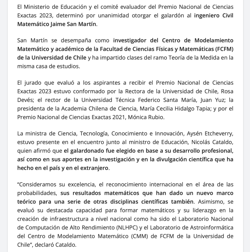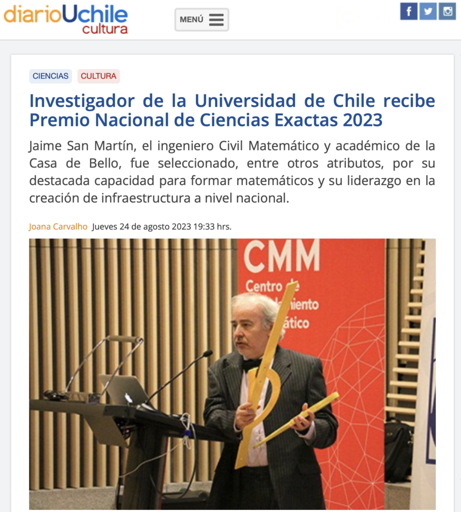El Ministerio de Educación y el comité evaluador del Premio Nacional de Ciencias Exactas 2023, determinó por unanimidad otorgar el galardón al ingeniero Civil Matemático Jaime San Martín.