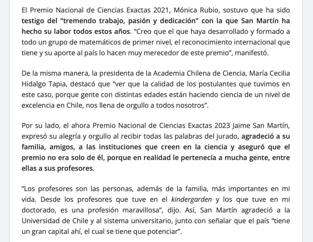 El Premio Nacional de Ciencias Exactas 2021, Mónica Rubio, sostuvo que ha sido testigo del “tremendo trabajo, pasión y dedicación” con la que San Martín ha hecho su labor todos estos años. “Creo que el que haya desarrollado y formado a todo un grupo de matemáticos de primer nivel, el reconocimiento internacional que tiene y su aporte al país lo hacen muy merecedor de este premio”, manifestó.