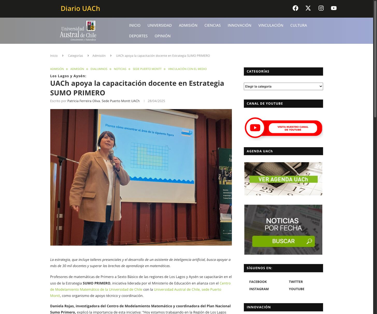 “Profesores de matemáticas de Primero a Sexto Básico de las regiones de Los Lagos y Aysén se capacitarán en el uso de la Estrategia SUMO PRIMERO, iniciativa liderada por el Ministerio de Educación en alianza con el Centro de Modelamiento Matemático de la Universidad de Chile con la Universidad Austral de Chile, sede Puerto Montt, como organismo de apoyo técnico y coordinación”, señala la publicación.