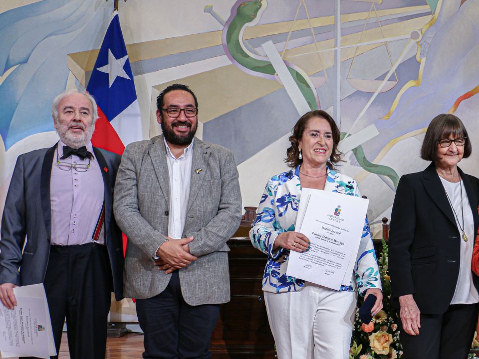 Como es tradición, la ceremonia de aniversario fue el momento de reconocer los logros de los Premios Nacionales 2023 que estudiaron o pertenecieron a la comunidad de la Universidad de Chile. En esta ocasión, se distinguió con la Medalla Rectoral a Jaime San Martín, investigador asociado al Centro de Modelamiento Matemático (CMM) y Profesor Titular del Departamento de Ingeniería Matemática de la Facultad de Ciencias Físicas y Matemáticas (FCFM), reconocido con el galardón en Ciencias Exactas; a Patricia Stambuk, receptora del Premio Nacional de Periodismo, y a Cecilia Vicuña, distinguida en la categoría de Artes Plásticas, ambas egresadas de la Casa de Bello.