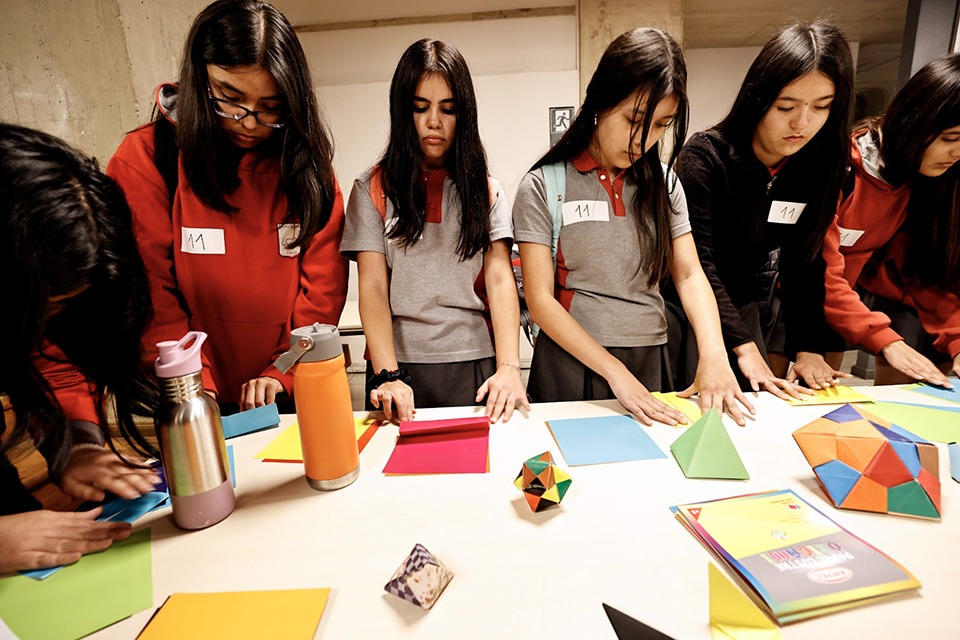 La tarde continuó con dos talleres participativos liderados por académicas y estudiantes del Departamento de Matemáticas de la Facultad de Ciencias, que incluyeron dinámicas de matemagia, papiroflexia y ejercicios creativos. “Ofrecimos en nuestros stands dos actividades pedagógicas. La primera fue Matemagia, un juego para adivinar un número que introduce, de manera lúdica, el concepto de los números binarios y enteros modulares: un contenido que habitualmente se estudia en la universidad, pero que aquí acercamos a estudiantes de enseñanza media a través del juego y la exploración”, relató Leslie Jiménez, coordinadora docente de la carrera de Pedagogía en Enseñanza Media en Matemática y Física, de la Facultad de Ciencias de la Universidad de Chile y parte del equipo organizador del evento.