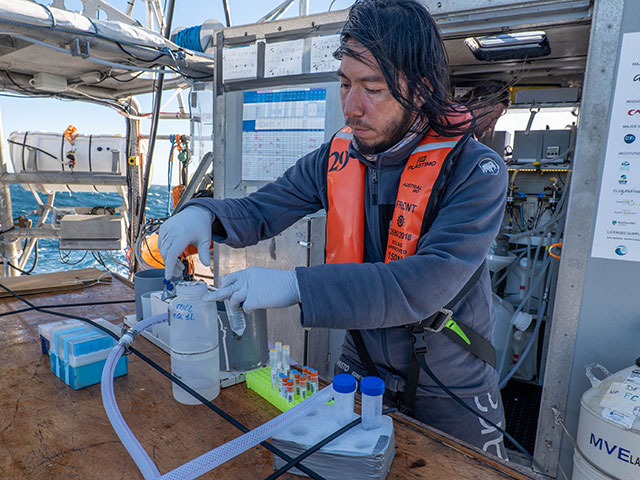 “Evaluaremos la intensidad con que está trabajando la bomba biológica usando isótopos estables para medir fotosíntesis en el agua, rendimiento fotosintético (que tan bien está de salud el fitoplancton) y evaluaremos la diversidad del microbioma durante el proceso de bombeo de CO2 desde la atmósfera. Esto trataremos de hacerlo en cada escala en laboratorios asociados a nuestra iniciativa CEODOS, en esta en particular con los centros COPAS Sur-Austral e INCAR” explica la Dra. Camila Fernández, profesora visitante del Departamento de Oceanografía de la Universidad de Concepción, investigadora del CNRS y de los centros INCAR, IDEAL y COPAS SUR AUSTRAL, y co-coordinadora de la misión en Chile.