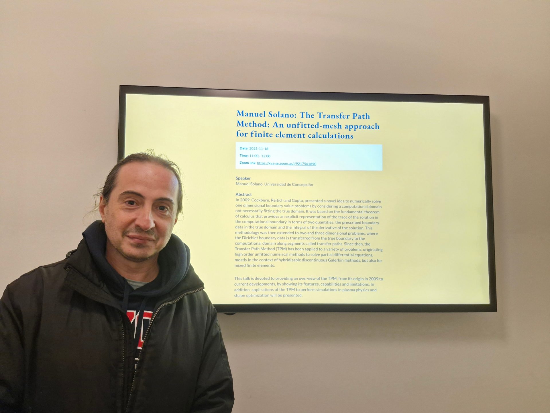 Por la directa relación temática de este programa con sus propios intereses de investigación, fue invitado a participar por Sara Zahedi a quien conoció en 2023 en la conferencia Enumath desarrollada en Lisboa. Y luego, ella fue una de las conferencistas plenarias del Seventh Chilean Workshop on Numerical Analysis of Partial Differential Equations, WONAPDE, realizado en Concepción en enero de 2024.